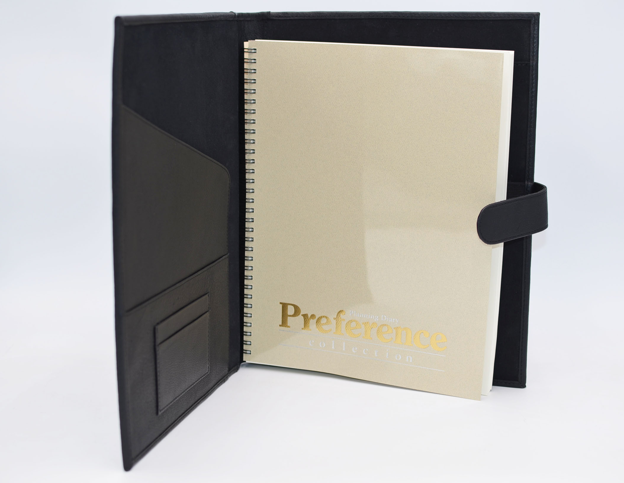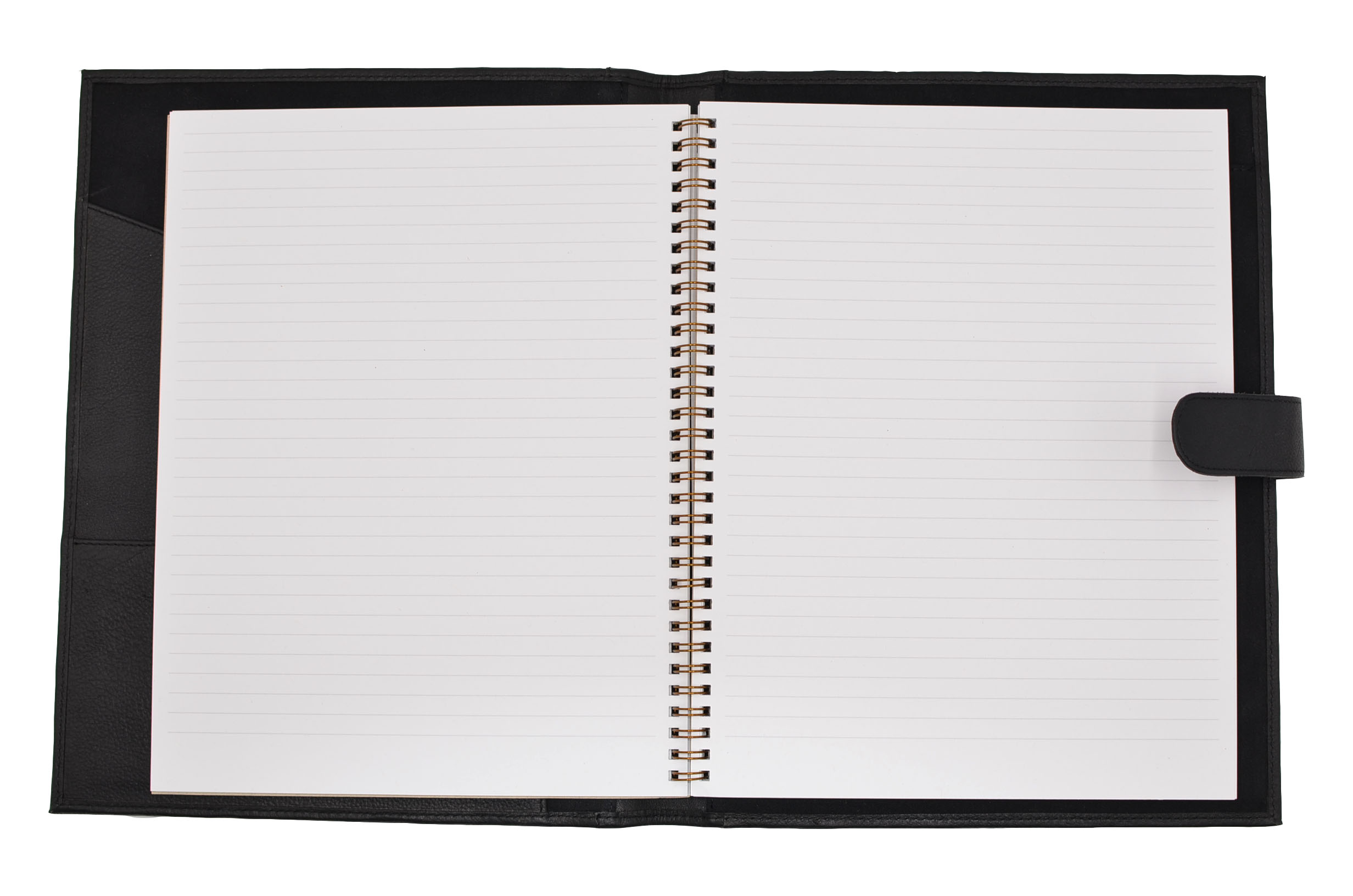 Genuine leather letter-size padfolio with flap closure, paper and business card pockets. Versatile padfolio that can hold a paper pad, agenda or journal insert.