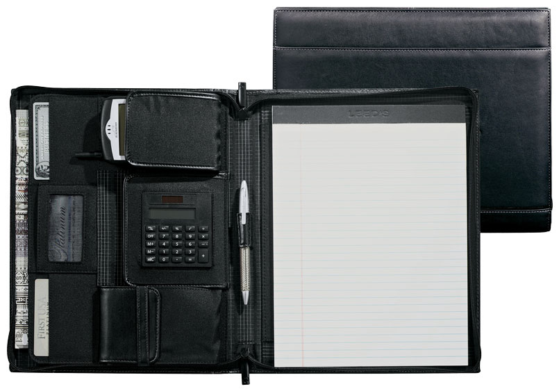 Zippered closure. Integrated calculator, and interior organizer with gusseted file pocket, business card pockets and cell phone pocket. Includes an 8.5" x 11" writing pad. Made of top-grain leather, and available in black. 10.13" x 13.38" x 1.25". A two-piece gift box is included.
